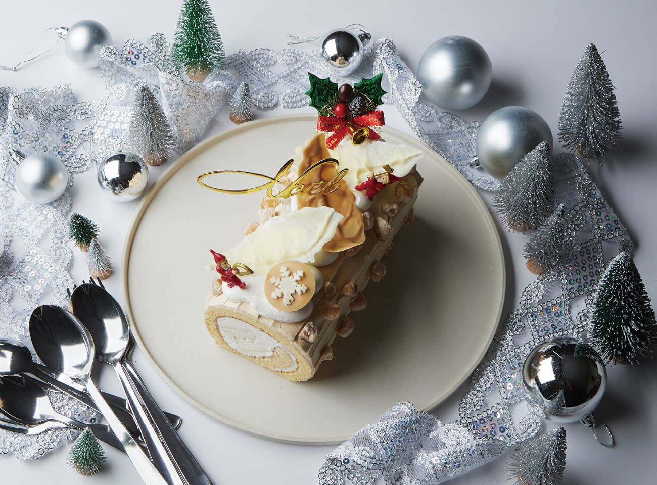切り株を思わせるフォルムに、芳醇なバニラが香るクリームを巻き込んだロールケーキ。仕上げにはキャラメル風味の生クリームをまとわせ、マカデミアナッツのキャラメリゼが香ばしさと食感のアクセントに。幻想的な冬の静けさと甘さを感じる一品です。