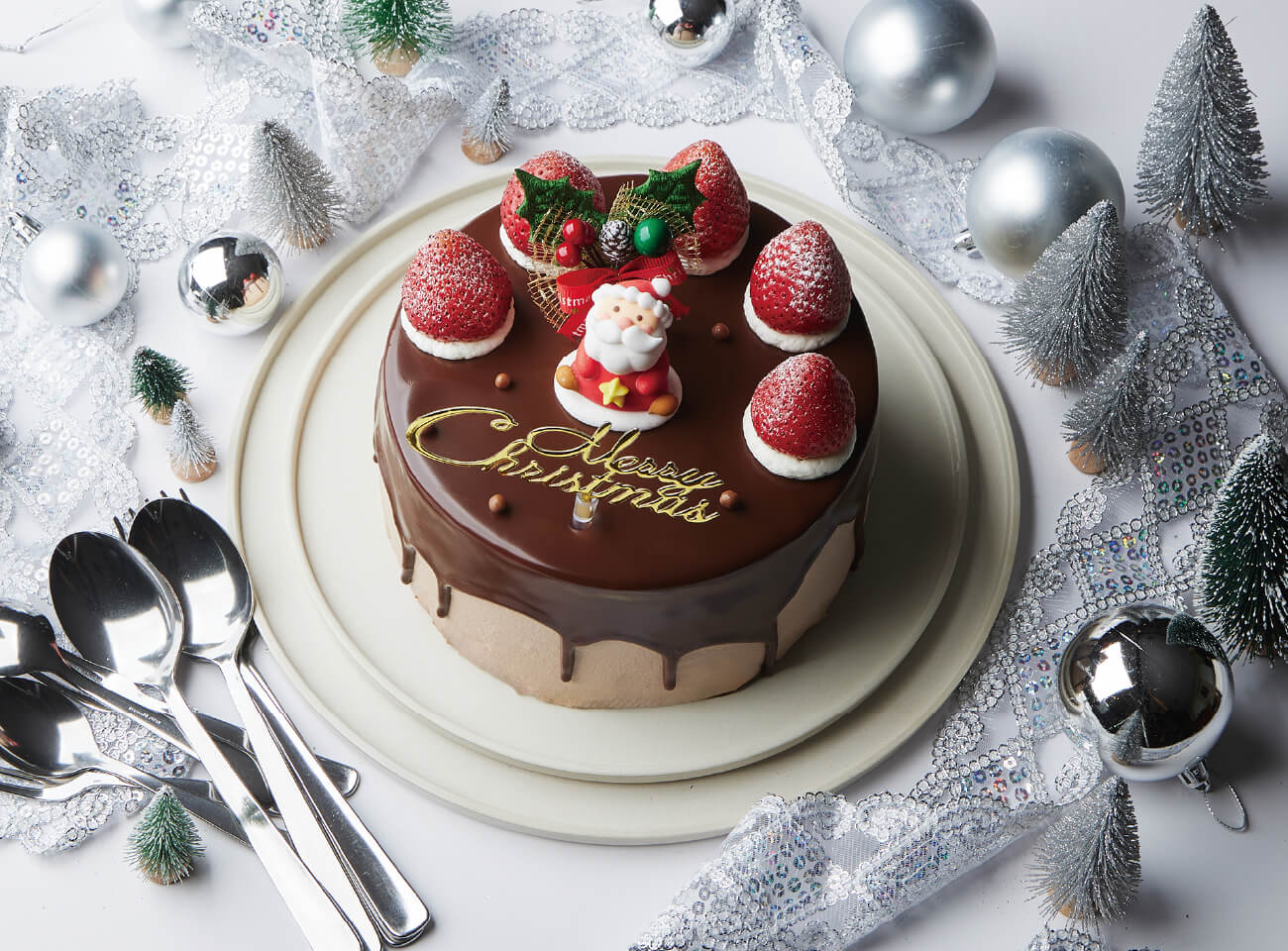 ショコラクリームとふんわりチョコシフォンが奏でる贅沢な味わい。苺とサンタの華やかなデコレーションが聖夜を彩る、チョコレート好きのためのスペシャルなクリスマスケーキ。ひと口ごとに広がる、至福のひとときをお楽しみください。