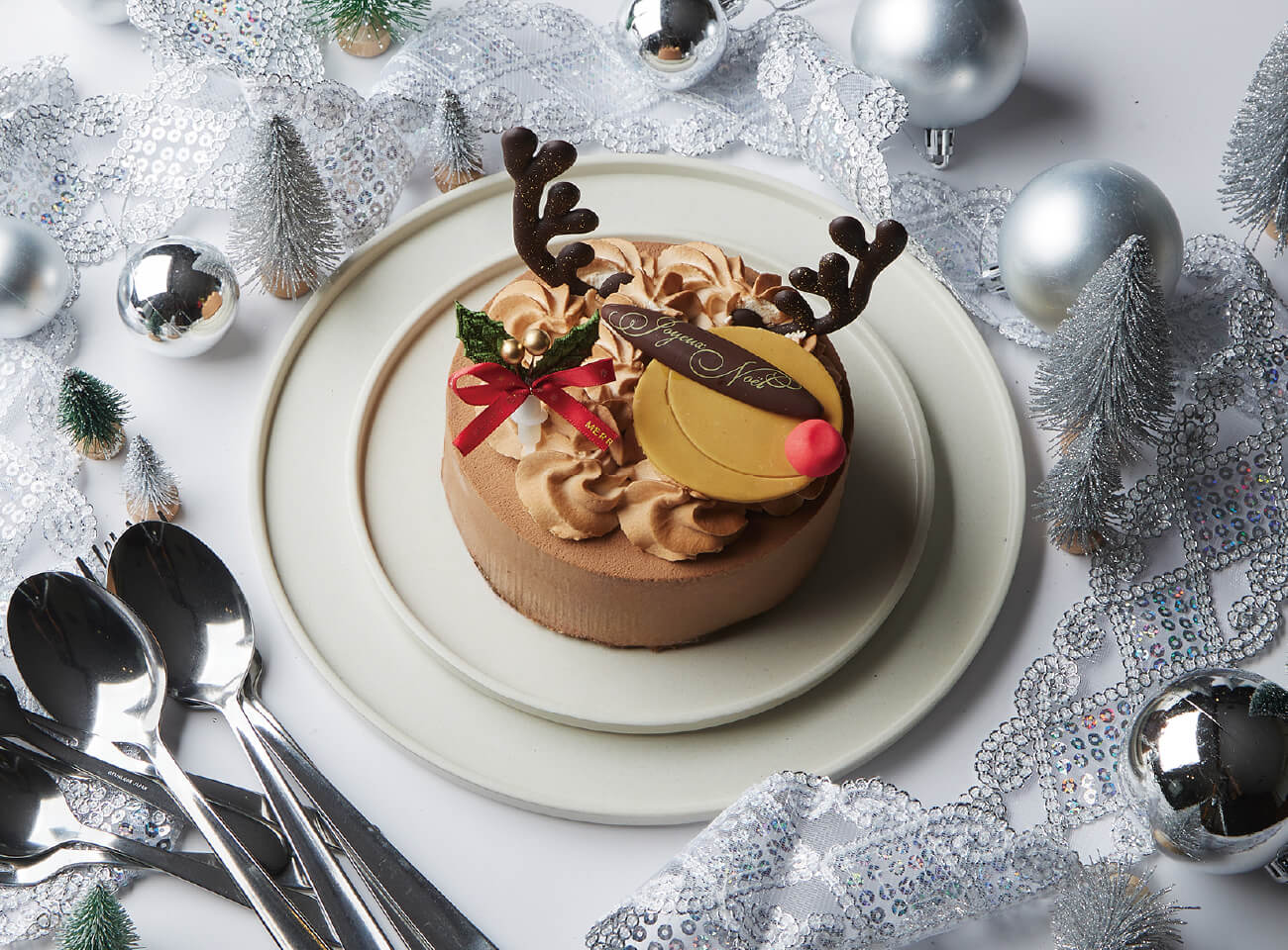 マイルドなミルクチョコレートムースの中に忍ばせたクレームブリュレとのマッチングが最高。ふわっと広がる甘いメープルの香りとサクサクのショコラフレークの軽やかな食感が楽しい真っ赤なお鼻とつぶらな瞳が印象的なトナカイさん。