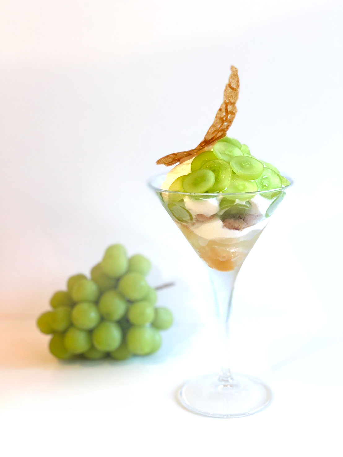 芳醇ですっきりとした甘さのシャインマスカットが主役のパフェ。上層はふんわり軽いヨーグルトエスプーマで爽やかな味わいに。最後にダージリンティーの心地良い渋みと、華やかに香るマスカットの余韻が感じられるパフェに仕上げました。