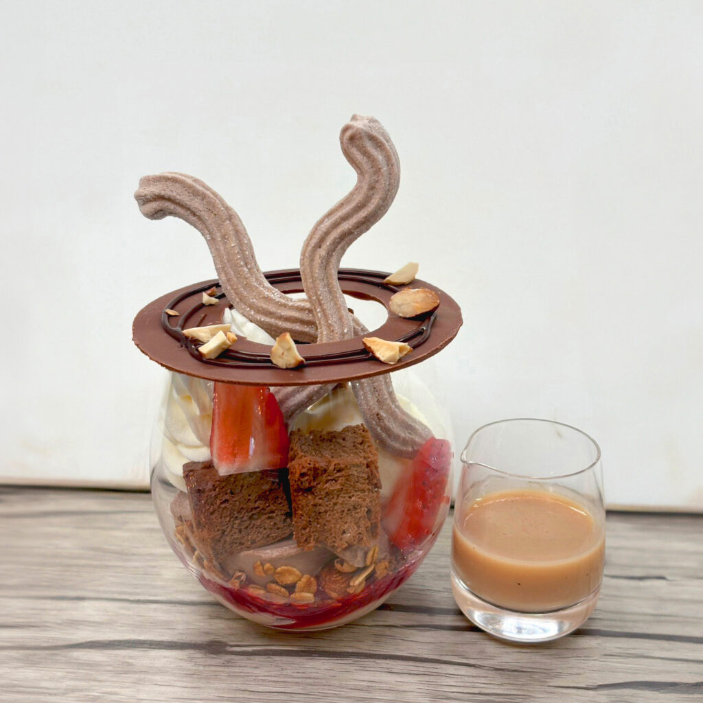 苺の酸味とチョコレートムースのほろ苦さが織りなすマリアージュ。グラスの中にはチョコシフォン、グラノーラなど食感と香りの層が広がります。