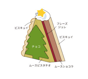 クリスマスツリーに見立てた限定ショートケーキ。ピスタチオと相性がいいショコラ、ベリーを重ね風味良く仕上げました。