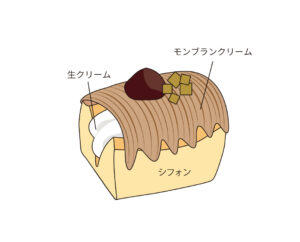 ふんわり柔らかなシフォン生地にバニラクリームとモンブランクリームをこんもり絞った薪型のお菓子。