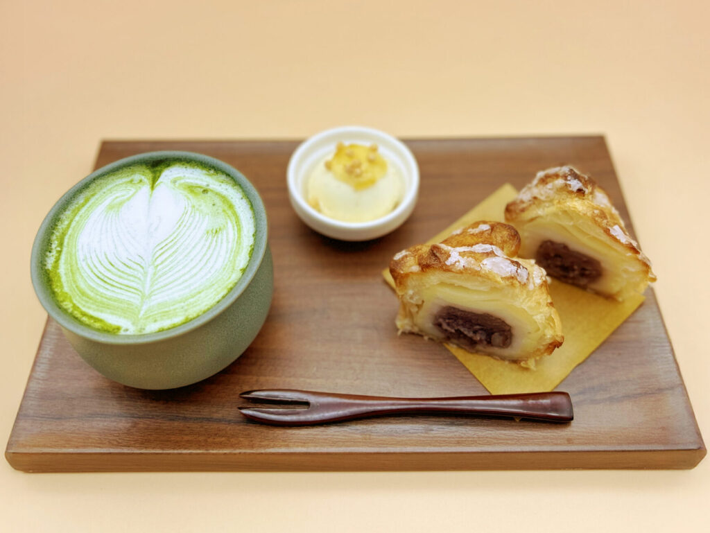 「FUKUラテ」ともっちりサクサクの「お餅のパイ」をセットでどうぞ。お得なプチアイス付きです。