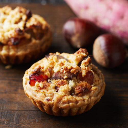 キャラメルを練り込んだ香ばしいほうじ茶生地に、丹波栗の