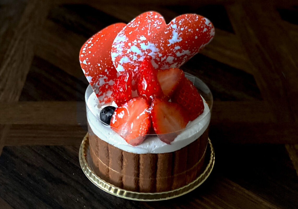 ¥1,850(税込)人気のロールケーキに真っ赤な苺とハートチョコをトッピング!見た目もかわいいデコレーションケーキ。